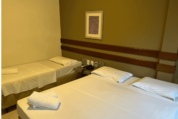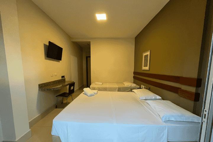 Acomodação destinada a três pessoas. A suíte tem duas camas, sendo uma box de casal e uma box de solteiro , ar condicionado, frigobar, wi-fi e tv a cabo. Nossos quartos são 100% não fumantes e para lhe oferecer uma melhor estadia você ainda conta com nosso delicioso café da manhã e estacionamento gratuito.
